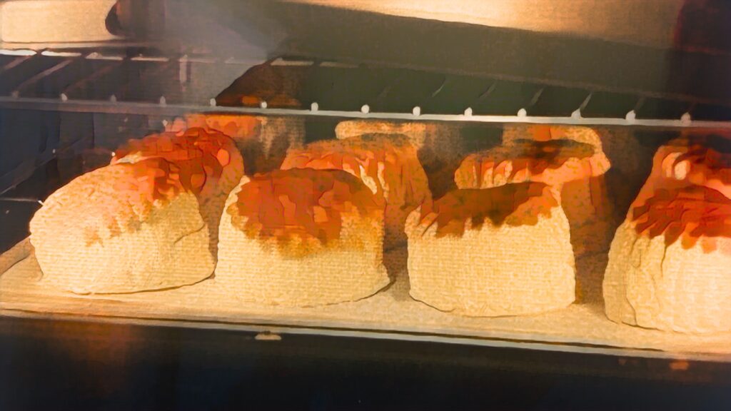 焼きムラを防ぐために鉄板を回転させる人、上下を入れ替える人、ベイカーが自分の経験を元に工夫して仕上げていました。